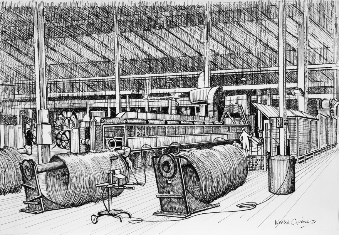 Print of a drawing of an interior view at Allied Steel and Wire Tremorfa works - Castle wire, 1987, showing wire coilers. Signed bottom right, but undated.