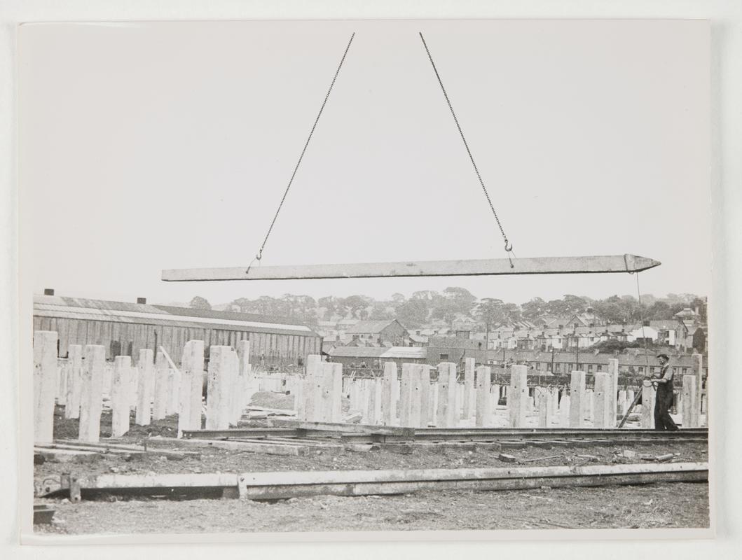 Black and white photograph of a painting showing Trefforest Tin Works. Photograph is mounted on a piece of card with a silver/grey border. Caption below painting (but still forming part of the photograph) reads "TREFORREST TIN WORKS, GLAMORGANSHIRE / To William Crawshay Esq. of Cyfarthfa Castle, Glamorganshire and Caversham Park Berks / This view is [illegible word] dedicated by his much obliged & humble [illegible word]"