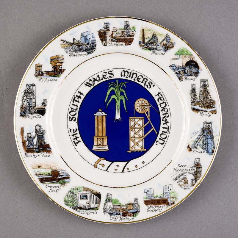 Circular bone china commemorative plate - North Wales Area National Union of Mineworkers. Banner with inscription at centre, and with names and dates of operation of various north Wales collieries around edge each with a view of the headgear etc. Design mainly in brown, yellow and red. Printed inscription on reverse.
