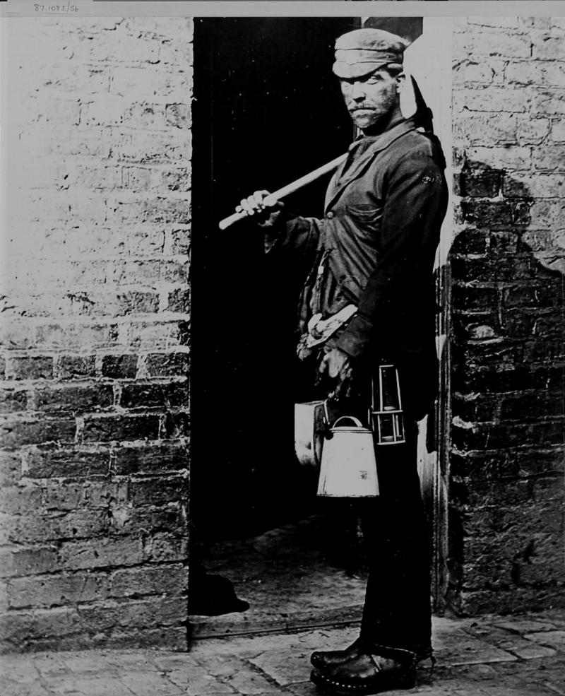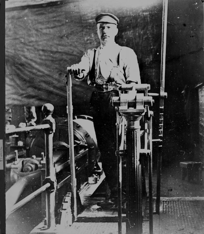 Black and white photograph showing man tamping a hole prior to filling with powder.