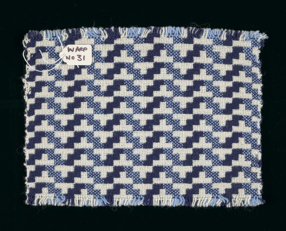 A swatch of five samples of woven wool with in the same pattern with a llabel 'Warp no 84'.The samples are in assorted greys, black and white. One sample has a label 'Designed and Handwoven by Alison Morton'.