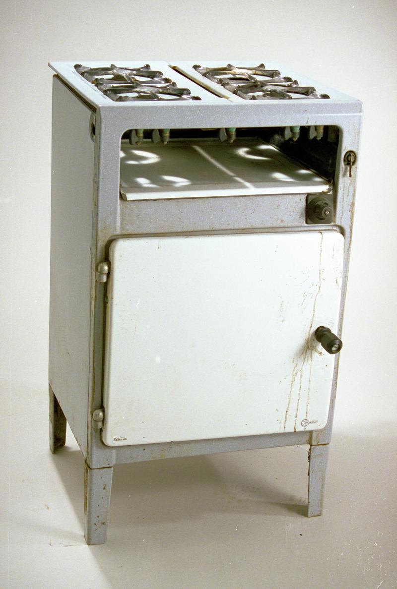 Gas oven on 4 adjustors; exterior casing of cream stove-enamel, interior lining of blue stove-enamel; consisting of 4 jets with cast iron burner; top frame; eye-level grill with hinged drop-type door to hold aluminium grill pan; chromed plate rack above; control knobs on front panel; oven with hinged drop-type door with aluminium bar handle and 3 chromed removable rack-type shelves; Regulo control knob on front panel; warming drawer below oven with aluminium bar handle; pilot-light fitting complete.