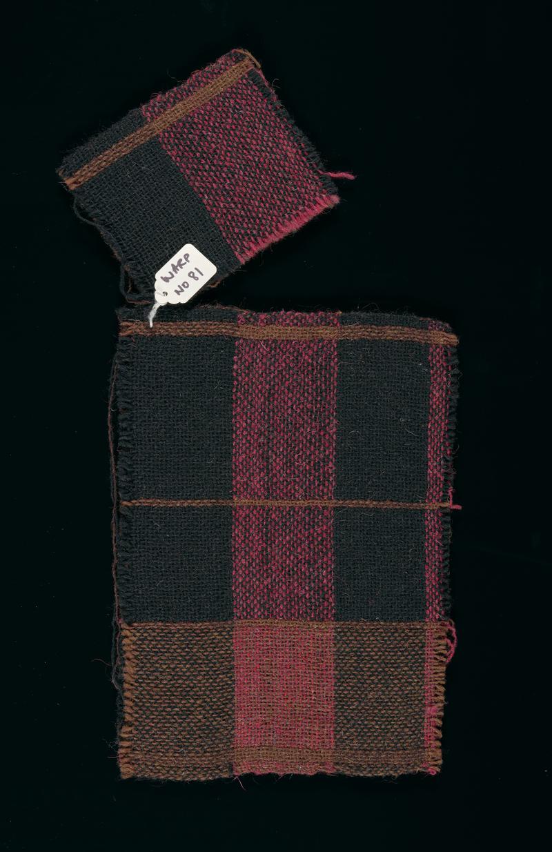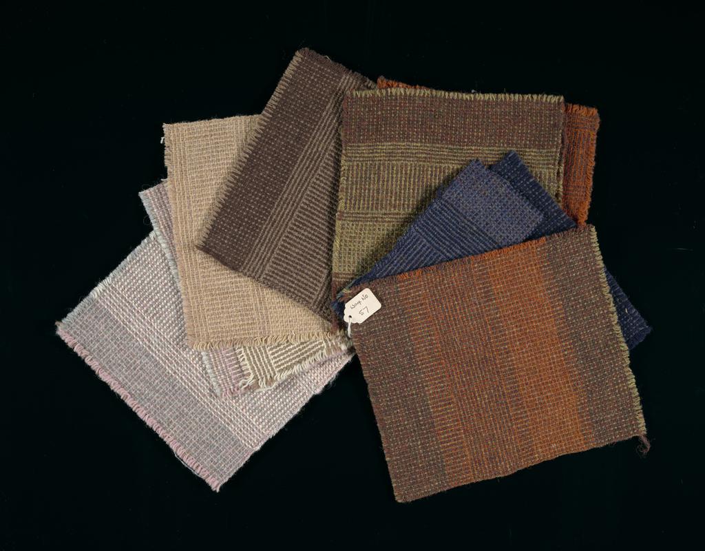 A swatch of fifteen samples of woven wool with label 'Warp no 94'. The samples are in assorted dark browns, oranges and greys, .