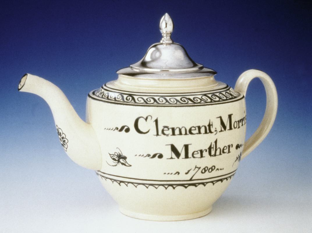 Jug, earthenware, octagonal pouch-shaped body, tapering at shoulder, ending in a lobed lip rim with raised narrow spout, the spout moulded with spreading acanthus leaf, wishbone handle with raised thumb-spur, lower terminal with foliate-type moulding; transfer printed in brown with overpainted detail in green, puce, blue and browny-yellow, with the 'Canton' pattern, consisting of chinoiserie-style scene of pagoda-type buidings with bridge walkway in foreground with two figures, enclosed within a cartouche of chinoiserie-style, shrub-type foliage, the pattern repeated on both sides, a border of concentric waved circles to lip-rim, issuing foliage and floral motifs, the same border to interior of lip-rim and to upper handle.