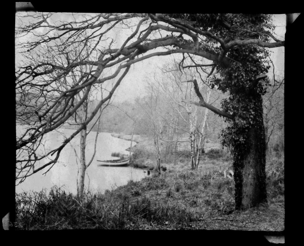 Calotype negative showing the Lower Lake at Penllergare with the boathouse in the distance. Tab at each corner