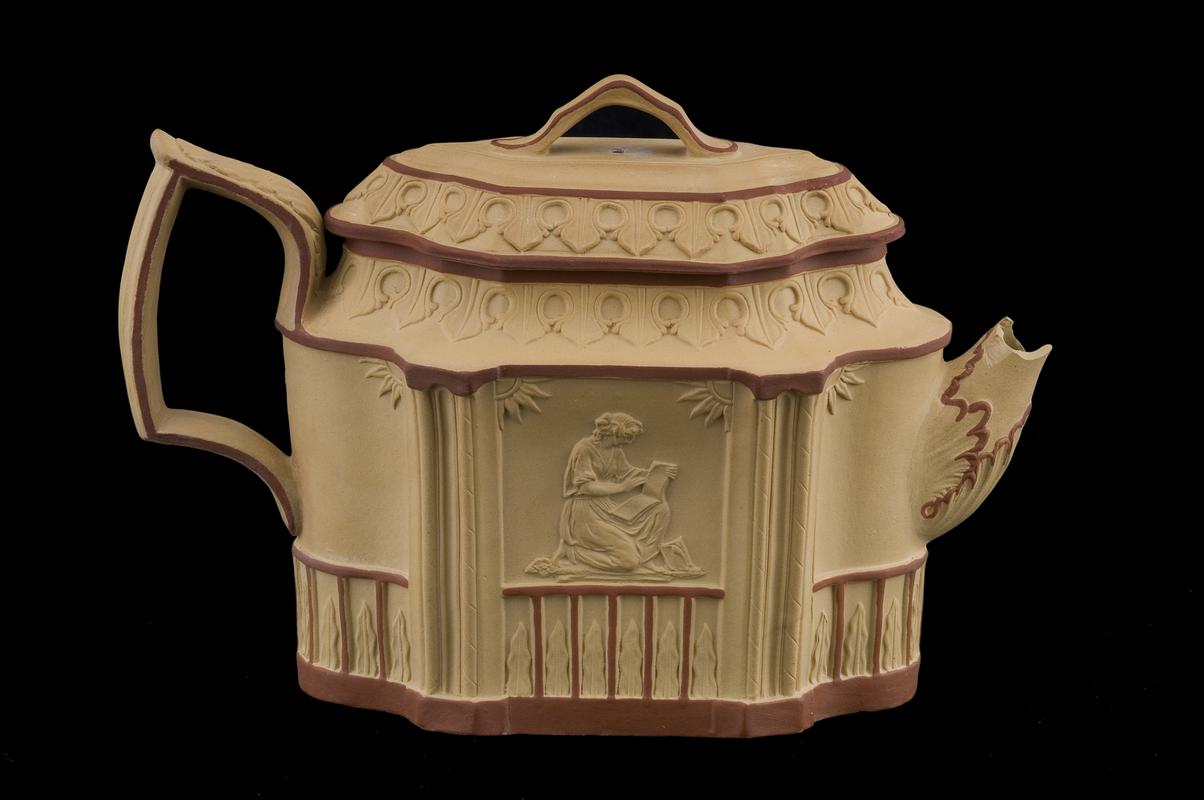 Teapot and cover, pearl-glazed earthenware, oval form, footring, stepped oval form, inverted collar neck up turned at either end and terminating in upturned scroll by handle, ear-shaped handle with thumbpiece and foliate moulding, flanged rim, spout with foliate moulding near mouth, boat-shaped domed cover with a ribbed flat-topped oval finial upturned at either end, body interior with twenty five pouring holes arranged in a diamond. Printed in on-glaze brown with a different vignette of shells and seaweed to either side of body; single shells to either side of spout; seaweed sprigs to either side of cover; dense band of leaves and flowers around collar neck and around cover; narrow black enamel band around foot, around rims of body cover and finial, around mouth of spout etc.