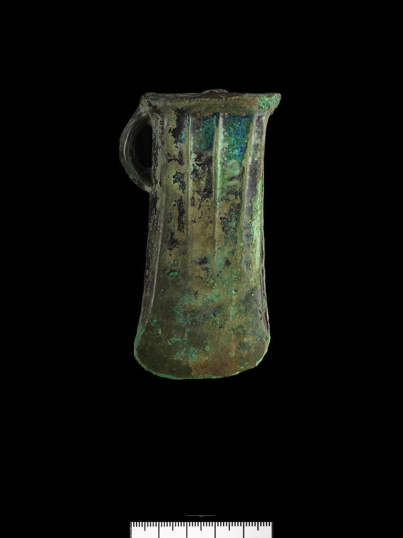 Leaf shaped, in two fragments, representing upper part of blade and butt with part of handle-plate, of Hallstatt "C" type, with two rivet-holes on each side of butt and simple, lenticular-sectiones blade.