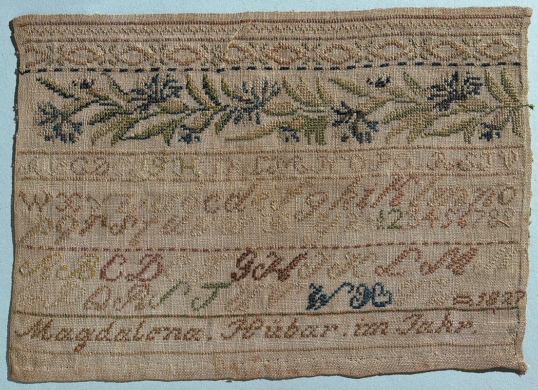 Sampler with various coloured threads, border of wreath and flowers in cross stitch and satin stitch. Motifs of birds and shrubs at the top, with tree of life below and a verse. Inscribed with maker's name and date.