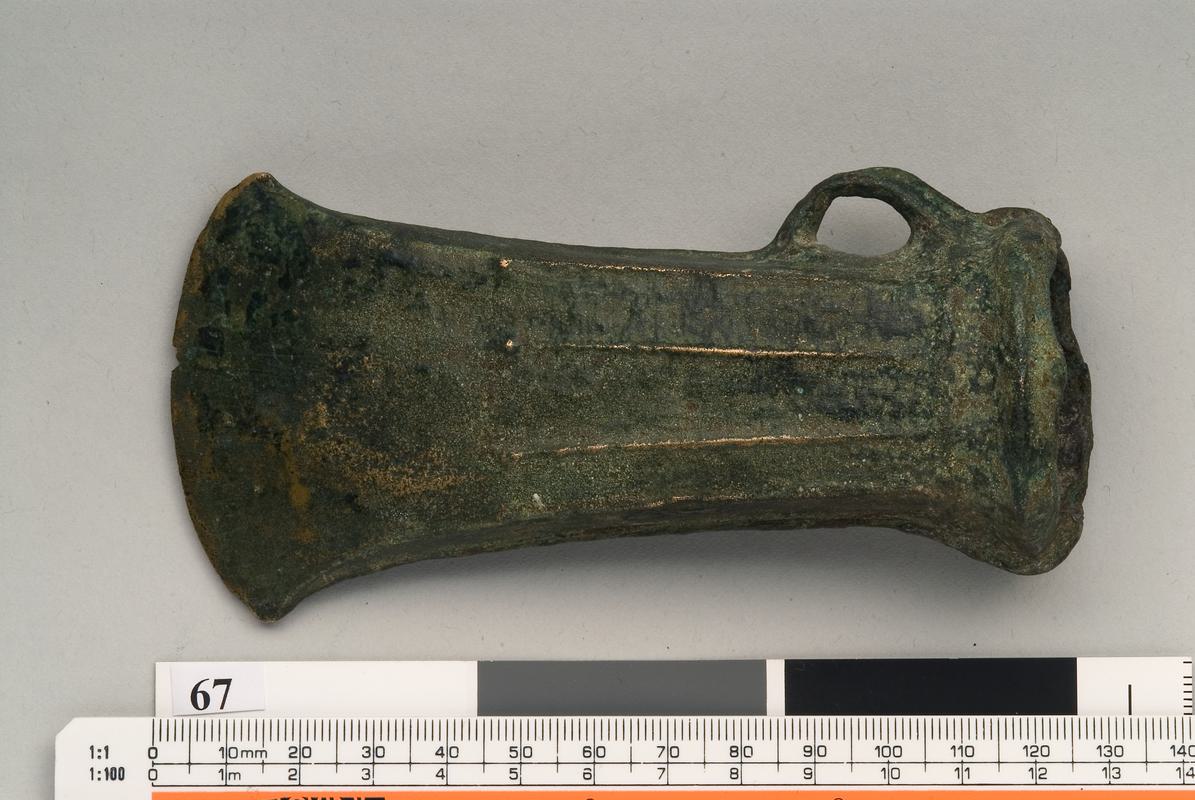 Cast of slender looped Palstave with narrow, slightly splayed blade and midrib (Breton type).
