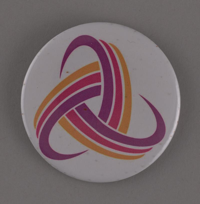 Badge 'LGBT+ Cymru Helpline & Counselling Service'. Given out at Swansea Pride, Saturday 30 April 2022. Collected to show the range of free promotional and advocacy material available at Pride events.