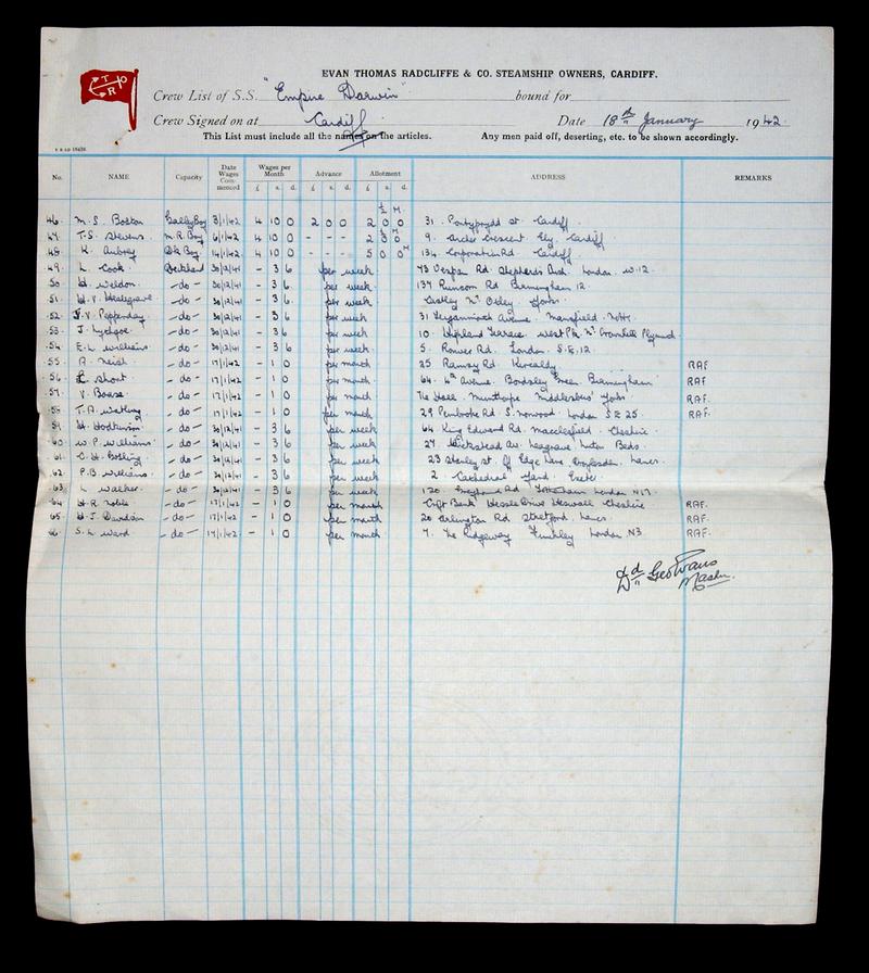 Cream paper with black print and hand written details in black ink and hand drawn graphs. Three pages held together with brass paperclip. Dated 1 Aug 1912 from Barry to Rio de Janeiro.