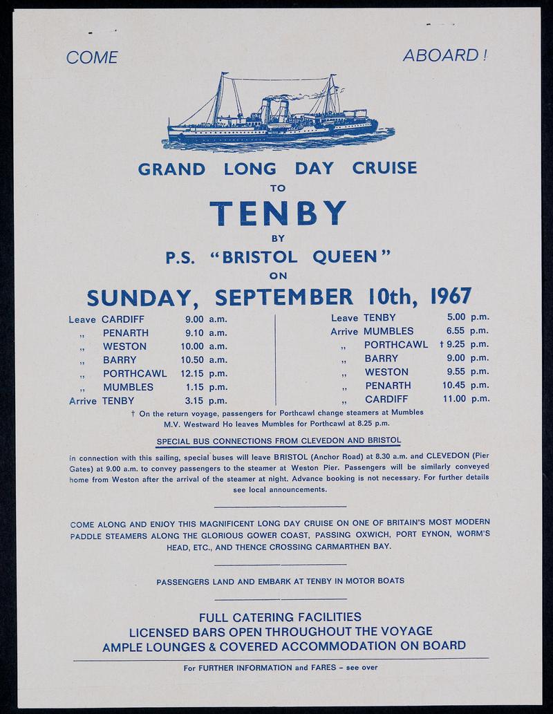 Blue print on cream paper. Come Aboard! handbill advertising 'Your First Opportunity Since 1938 to Sail to Padstow' on board the BRISTOL QUEEN, August 8, 1965.