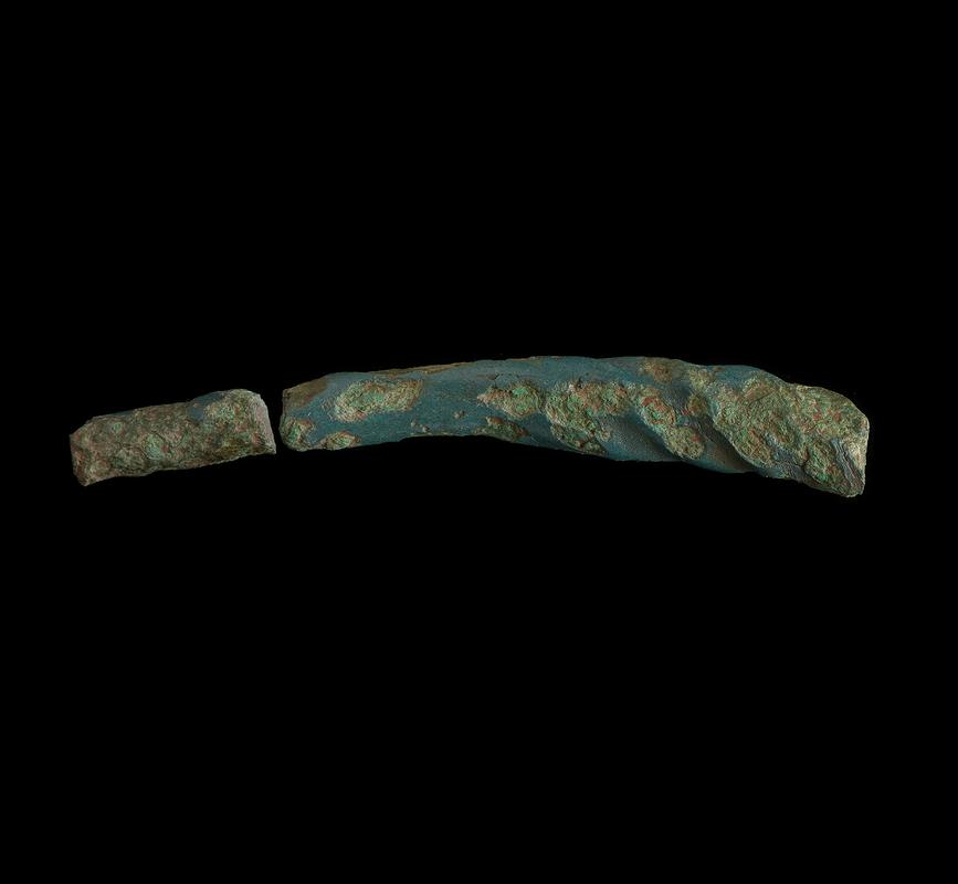 A good conjoin is evident between the soil covered fragments. At the non-terminal end, the twisted upper surface has been shaved off, revealing bronze metal at the surface, and the end break is not fresh. There is differential corrosion and pock-marking on one surface, where the patination is a lighter grey green. The reversed surface is in better condition and has a dark grey-green patination.