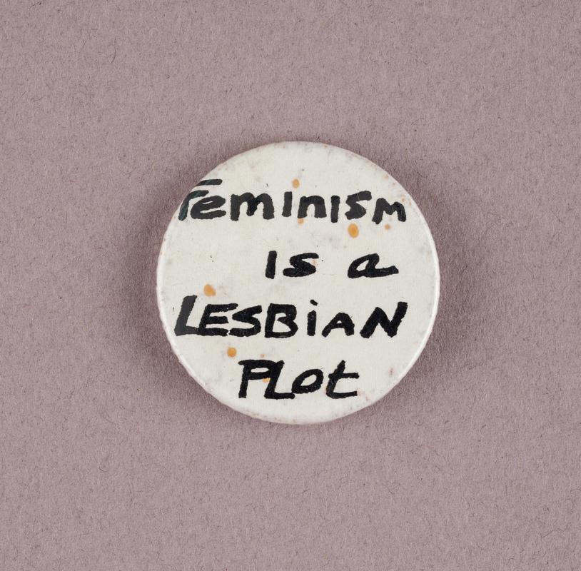 Badge with inscription 'Homophobia' on white background with red line through.