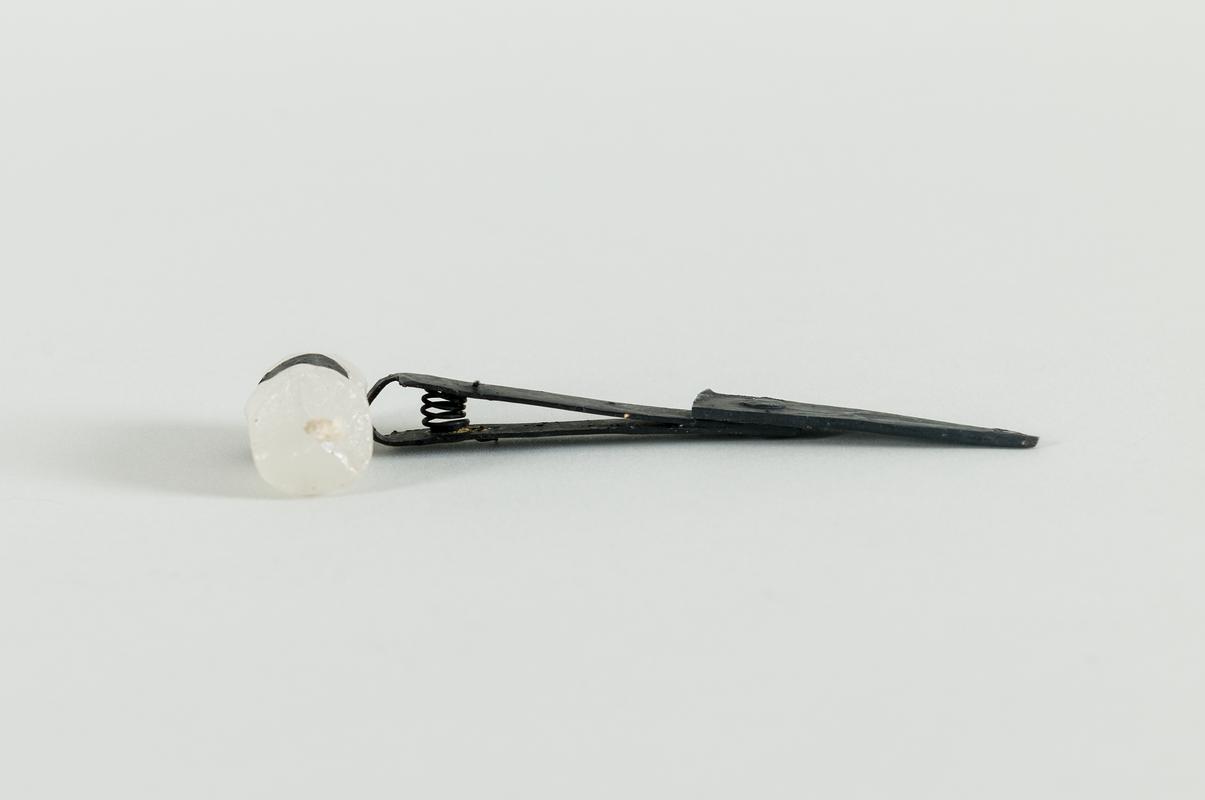 Four stem candle holder. Large rectangular candle shield. Spike at base. Originates from Garth iron ore mine, Taffs Well, Mid Glam.
