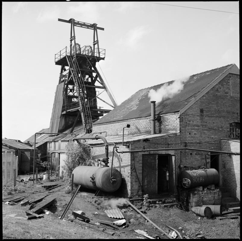 Black and white film negative showing a surface view of Ffaldau Colliery, 15 April 1980. 'Ffaldau 15/4/80' is transcribed from original negative bag.