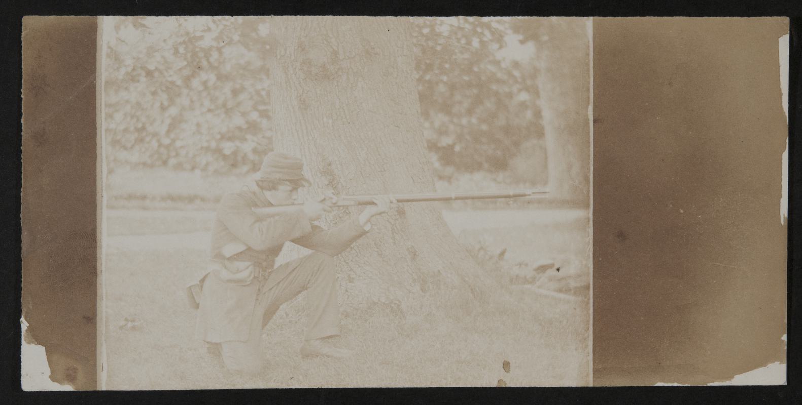 Salted paper print. Willy Llewelyn at the front of Penllergaer House with a dog, a white rabbit and a vase of flowers. All corners snipped.