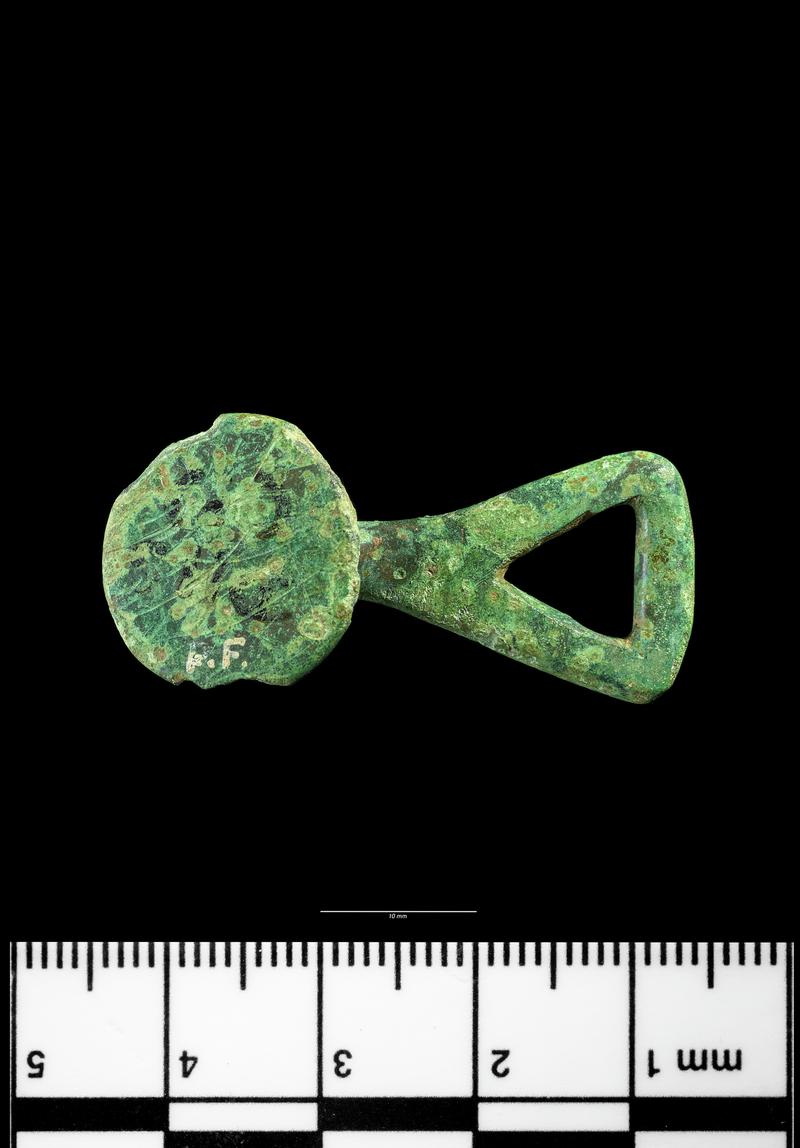 Disc-headed stud with loop attachment, probably a fastening for leather. Chapman: class VIIIa with plain disc-head, only very slightly domed, and a frail jointed loop.