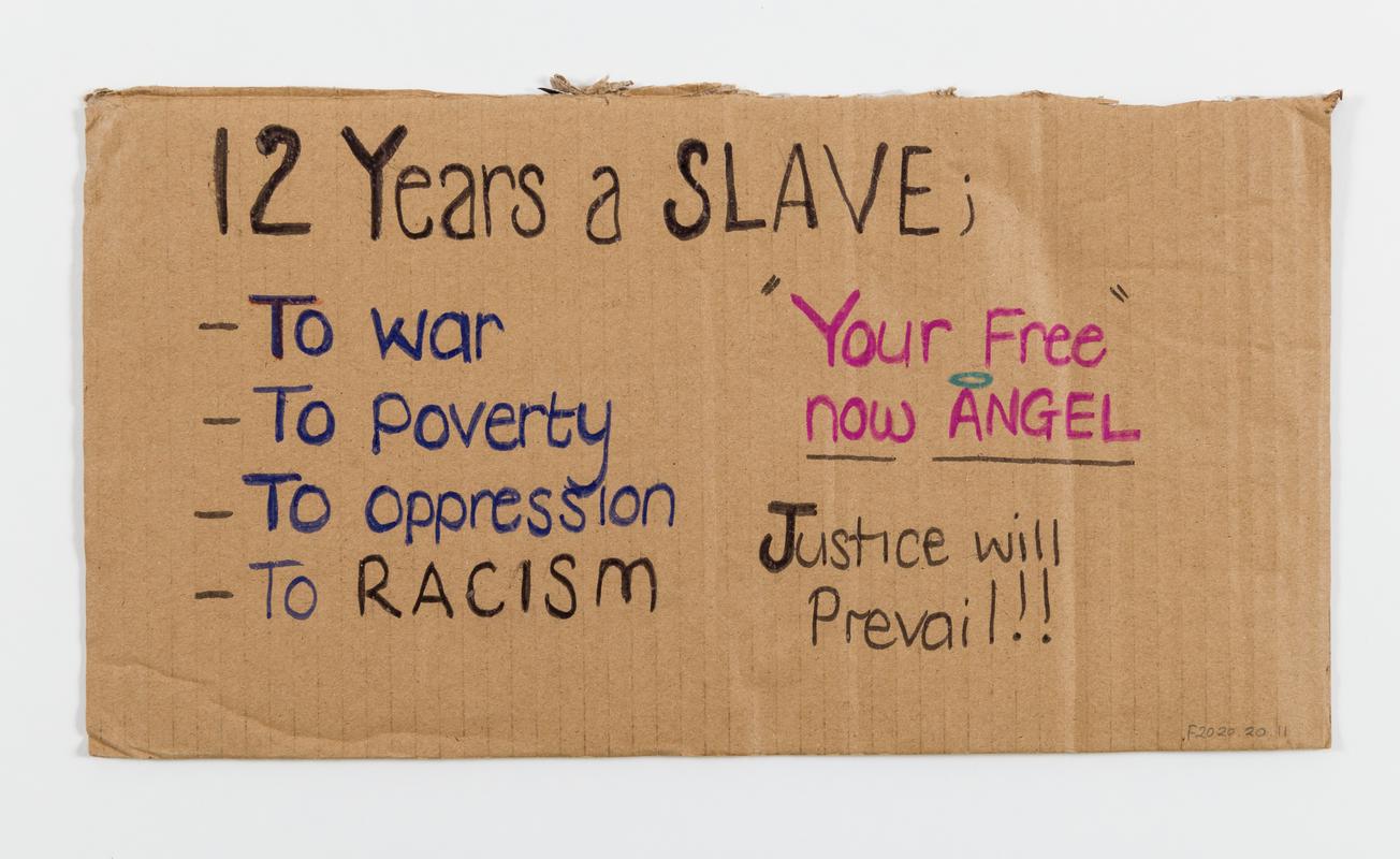 Placard made for a pro-Palestine demonstration in Cardiff. Brown cardboard with hand-drawn slogan 'FREE PALESTINE'.