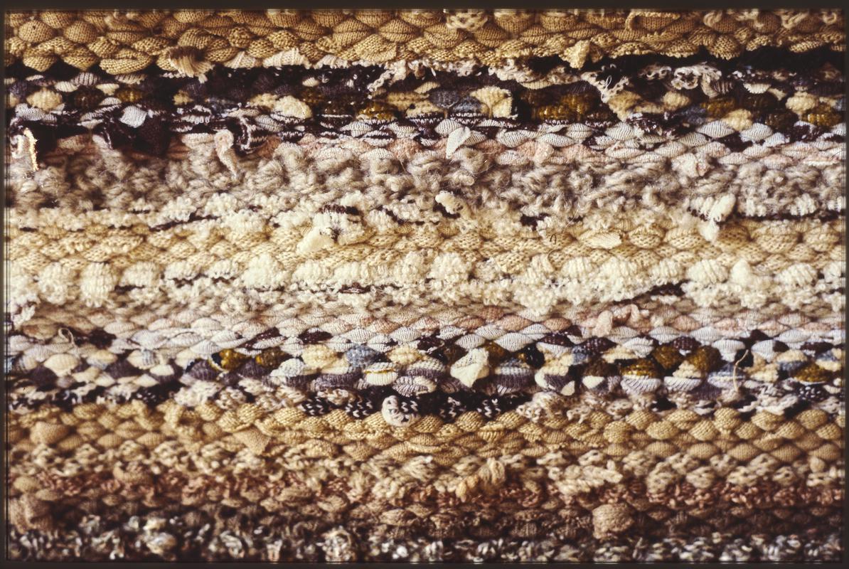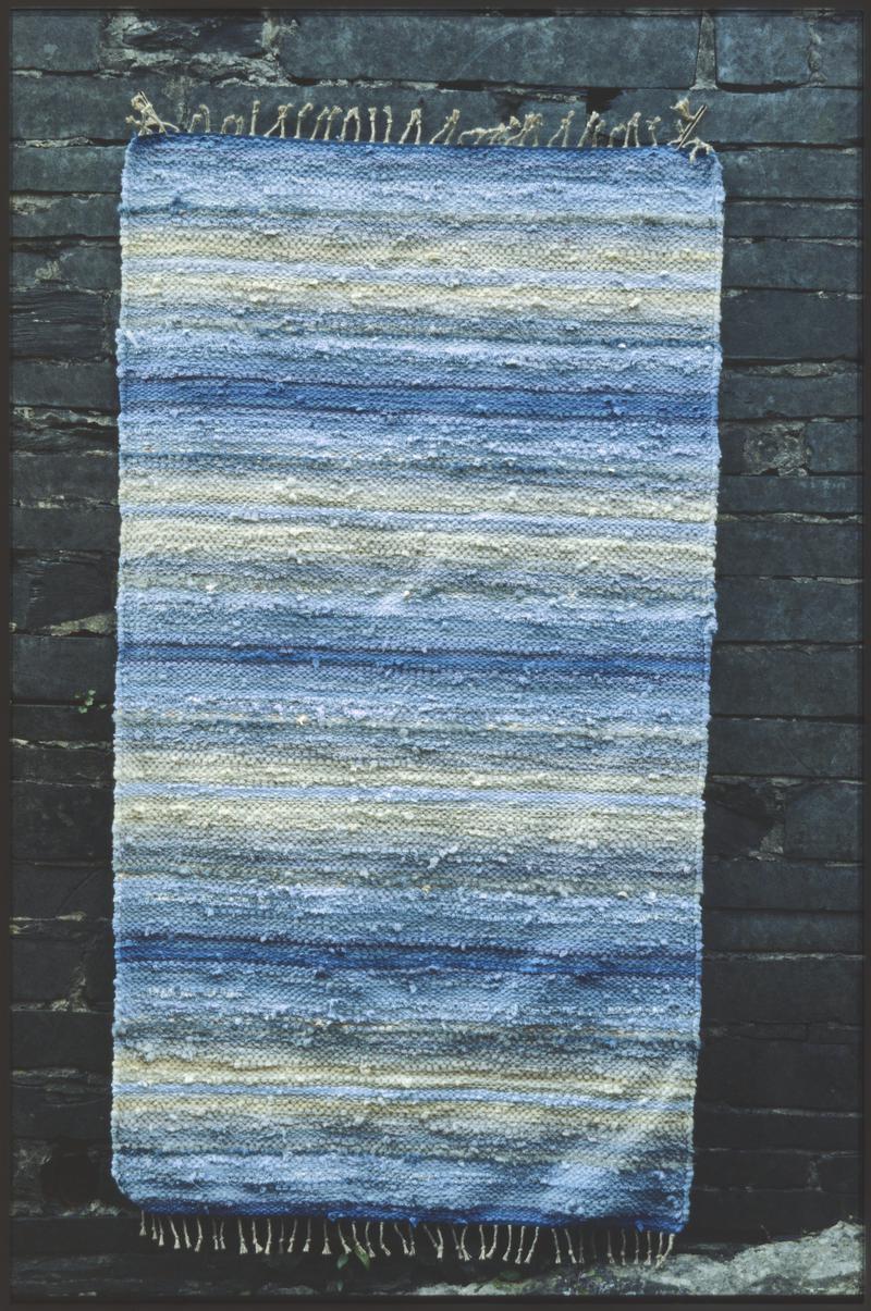 Light blue, dark blue and black floor rug with fringe on two ends.