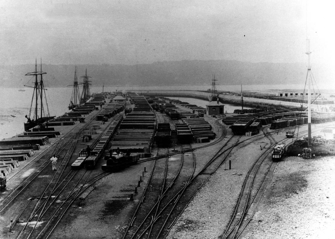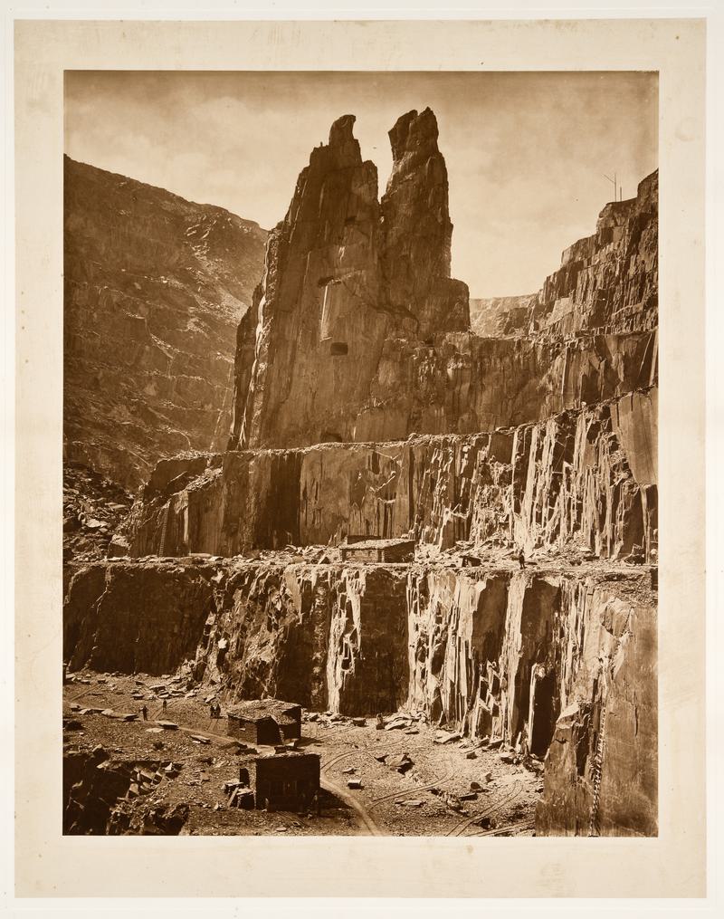 Three members of a Bargain Gang making slates at Penrhyn Quarry. Tools used include the Rhys Mawr (large mallet), manholt (broad bladed chisels), cyllel fawr (large crank-handled knife as used by the man on the left), and trafal (a sloping stool & bench on which is mounted a fixed cutting edge). Measuring stick seen on left hand side, each notch denoting size of slate e.g. Queen, Lady, Duchess etc.