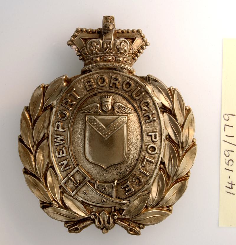 Metal helmet plate. With image of a tree inside a belt, surrounded by a wreath and with a crown on top. Belt inscribed ANGLESEY CONSTABULARY. 2 loops at back for attachment