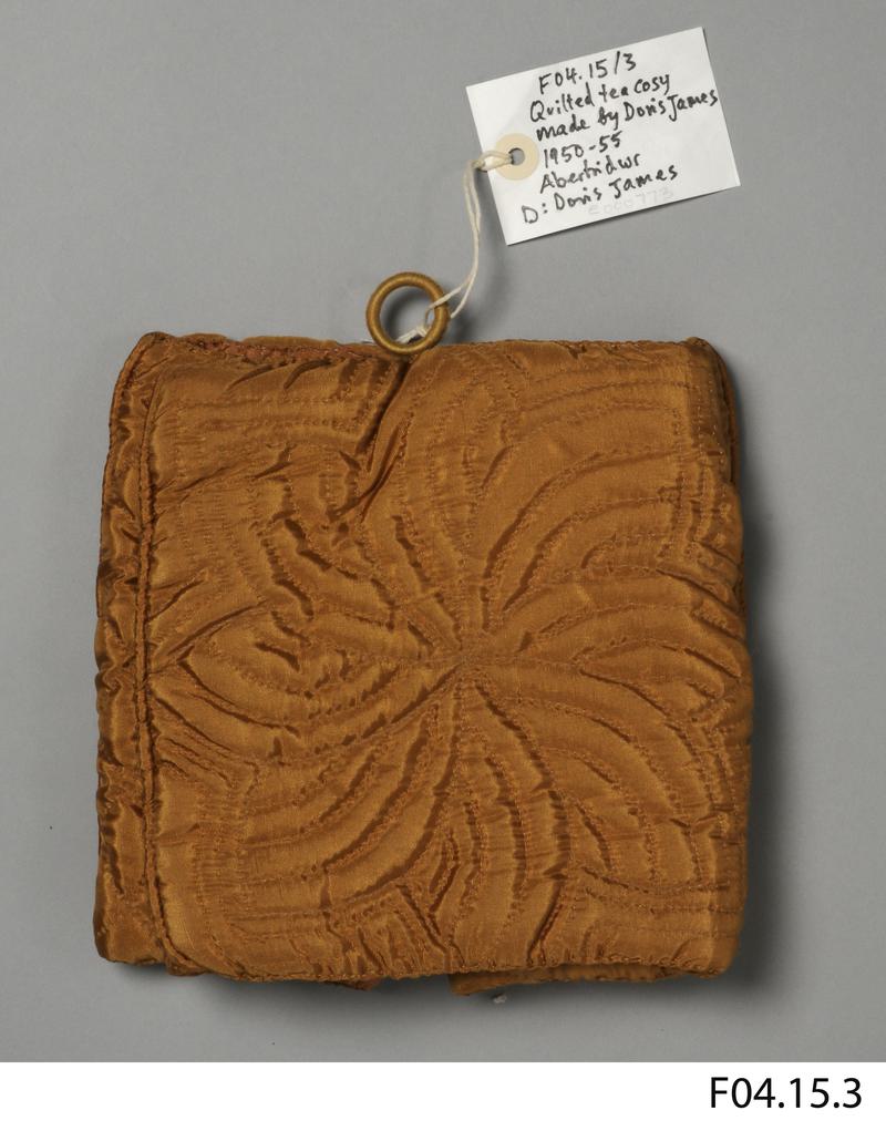 Quilted cushion made by Doris James (1923-2015), a hairdresser from Abertridwr. The work was awarded a prize at the National Eisteddfod in 1950, and at a quilting exhibition held in the grounds of St Fagans Castle in 1951. The event was staged in conjunction with the Festival of Britain.