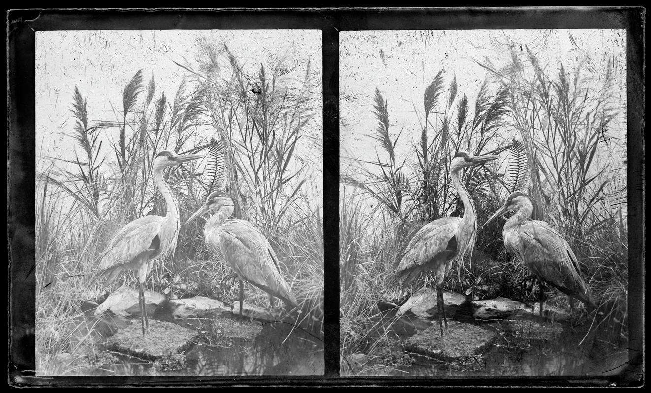 Salted paper print, from Collodion glass negative. Mounted heron in pool at the base of rock face.