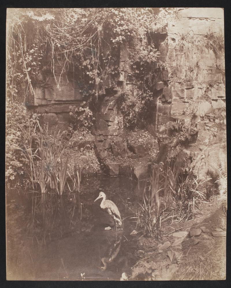 Salted paper print, from Collodion glass negative. Mounted heron in pool at the base of rock face.