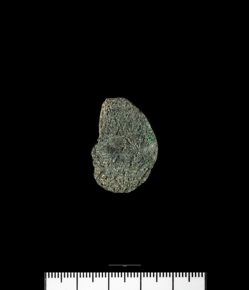 Single runner casting jet. Complete and well preserved single runner casting jet, oval to teardrop shaped in plan. On one side, the reservoir is convex and trumpet shaped in side profile, whilst on the other it is concave and is undercut. The upper reservoir surface is rough and uneven, dipping slightly at the centre, and the lower surfaces are uneven in shape. The lowest 12mm section of the jet is smooth and deliberately moulded into a semi-circular tapering runner form, with a distinct line separating it from the uneven surfaces of the base of the reservoir. The upper end of a narrow casting flash, some 9mm long, adheres to the side of the runner in a strip 4mm wide, indicating insertion between two mould pieces here. The jet has a dark green patina.
