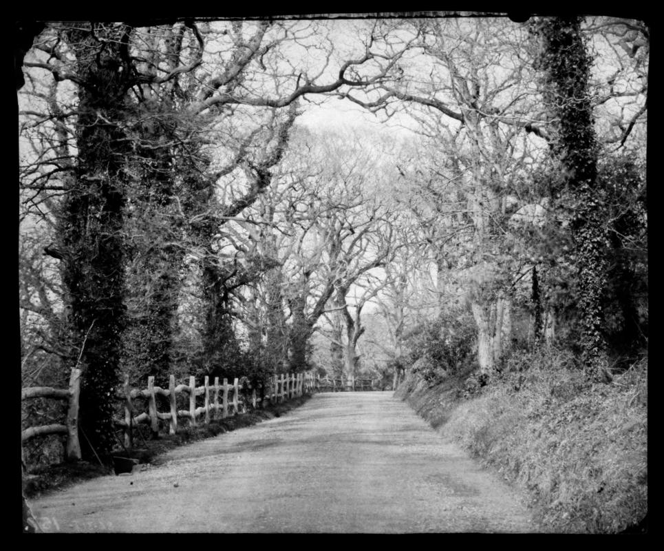 Waxed calotype negative with tab at each corner. Driveway to Penllergare through wooded landscape.