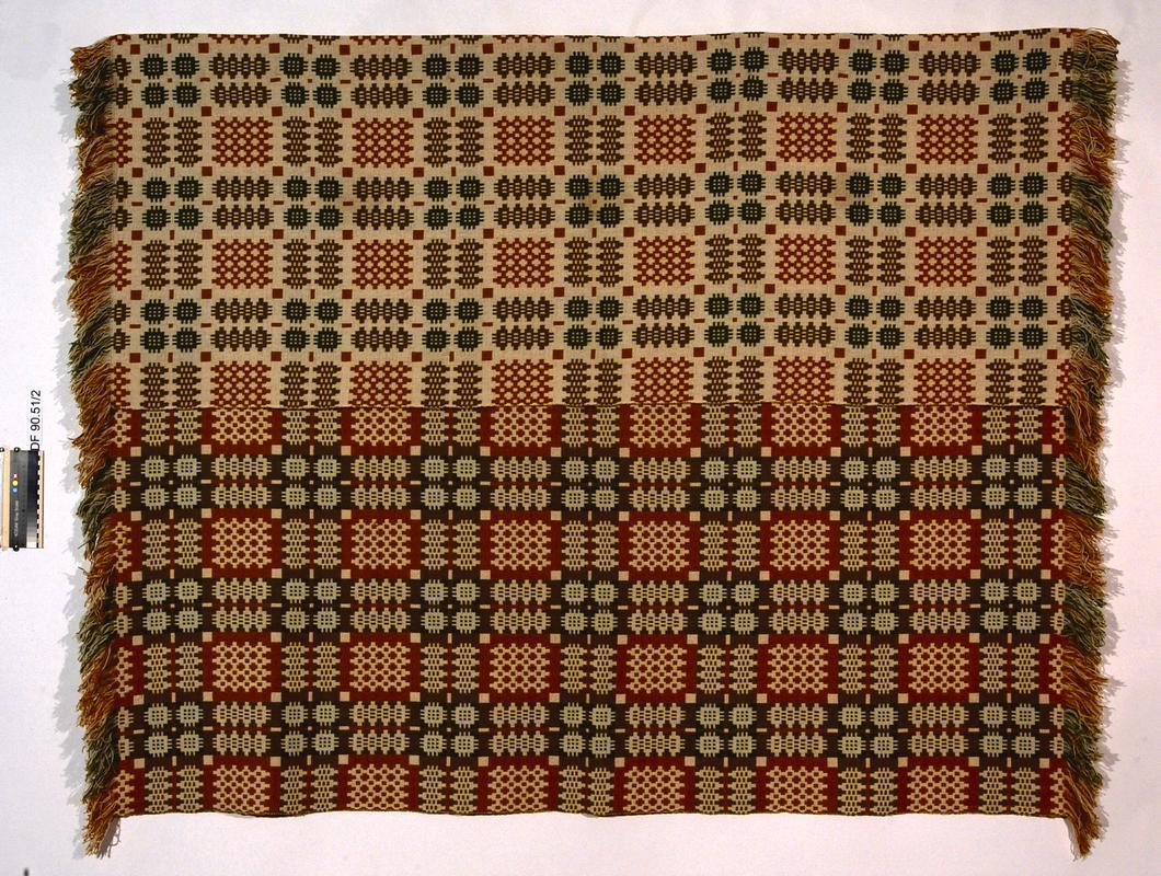 Tapestry bedcover. Pink, blue, white and brown with plain selvedges and fringe at each end (warp end). Woven at Cambrian Mills, Drefach-Felindre.