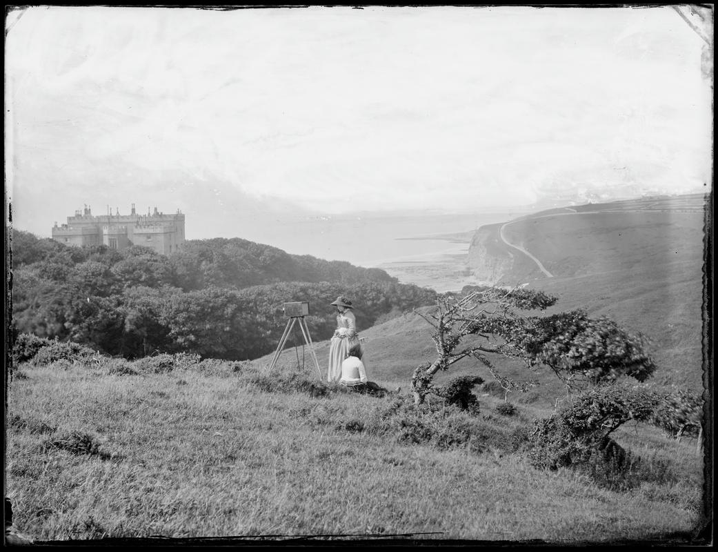 Calotype (negative). View of the cliffs and coastline at Dunraven, Glamorgan, at low tide. Taken from an elevated position above the beach, but below the cliff top, and showing rock stratification. Tabs on all four corners.
