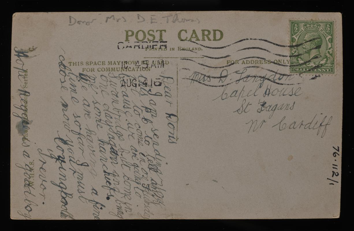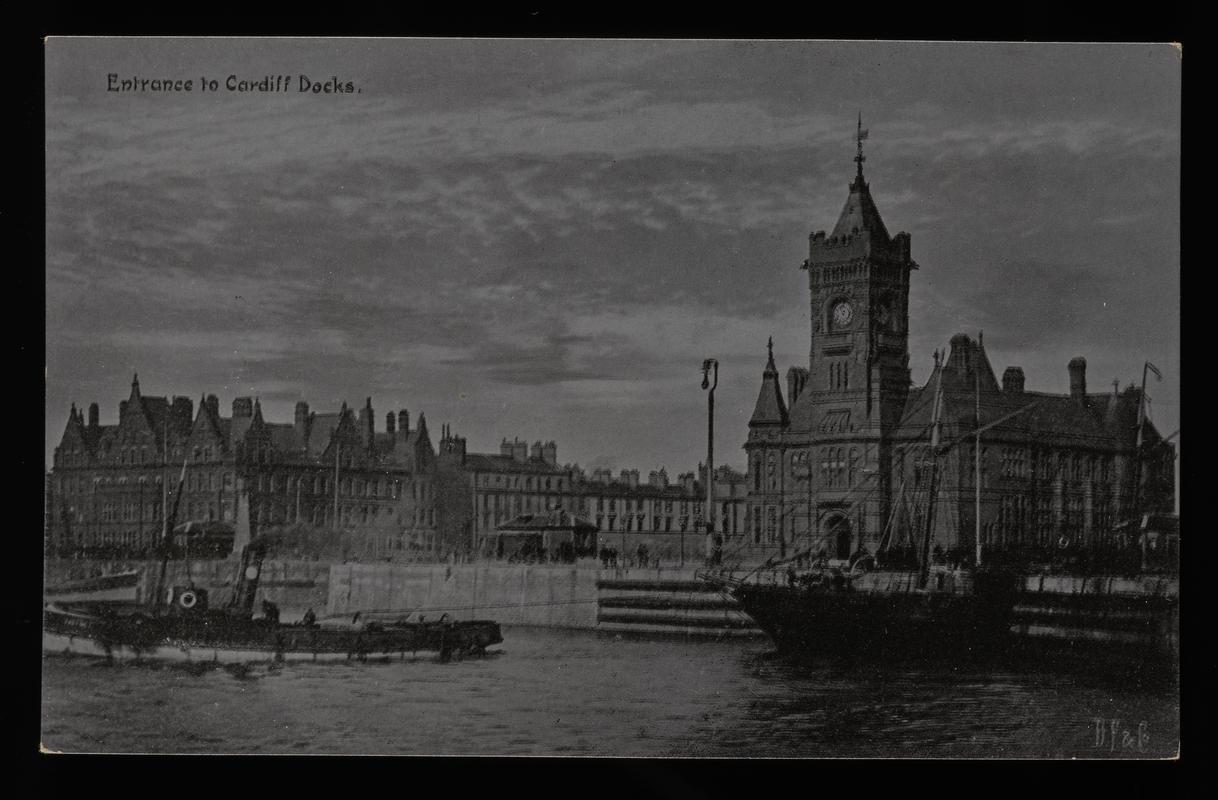 Colour postcard : "The Pier Head, Cardiff". Sent to E.E.B Jones of Swansea. Postmarked 26 September 1907.