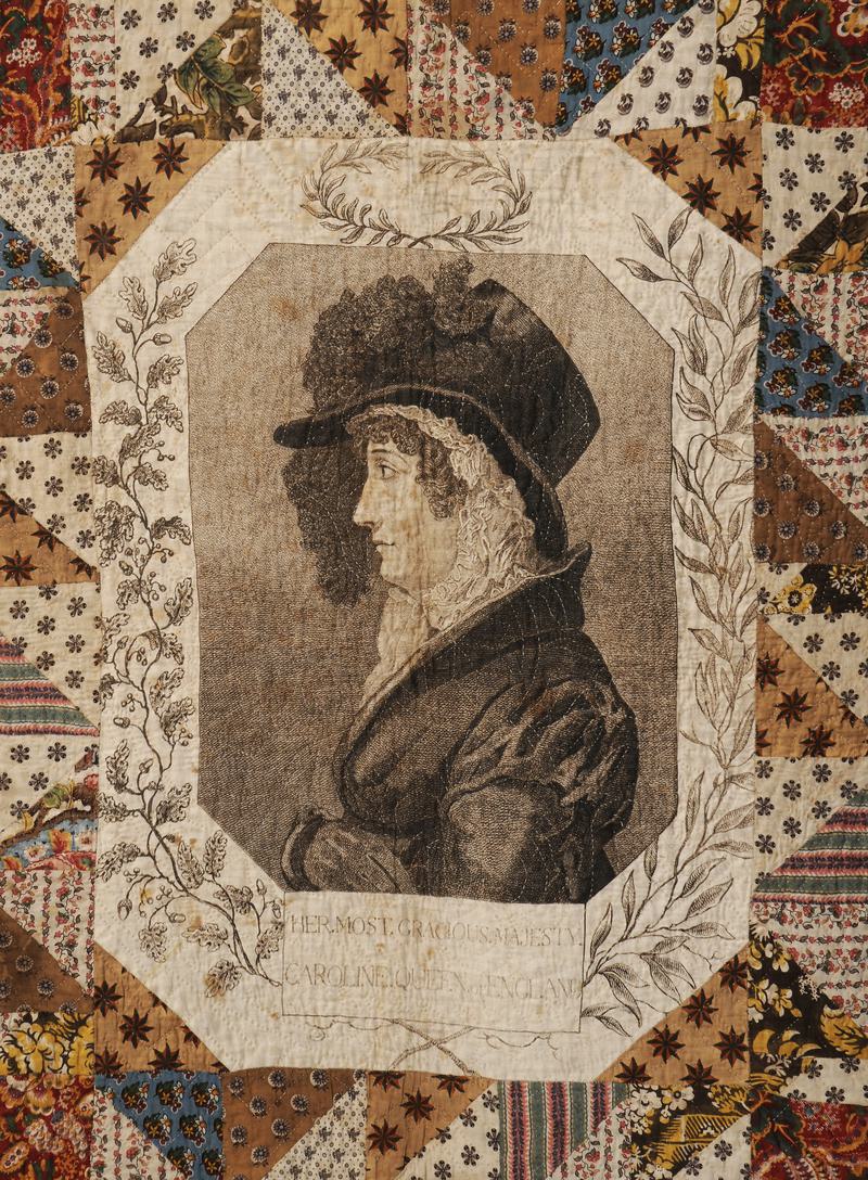 Quilted patchwork bedcover. Made in about 1820 from a range of printed (and some glazed) dress cottons arranged haphazardly in triangles. A printed central octagonal panel contains a portrait of Queen Caroline, consort of King George IV, with the inscription ‘Her Most Gracious Majesty, Caroline Queen of England’. The quilting pattern consists of a central roundel containing a star within a circle and four petalled flowers. Two narrow inner borders feature spirals and triangles. The outer border contains spirals within triangles. The quilting bears no relationship to the patchwork. Plain white cotton tabby backing made up of various pieces. Carded wool filling.