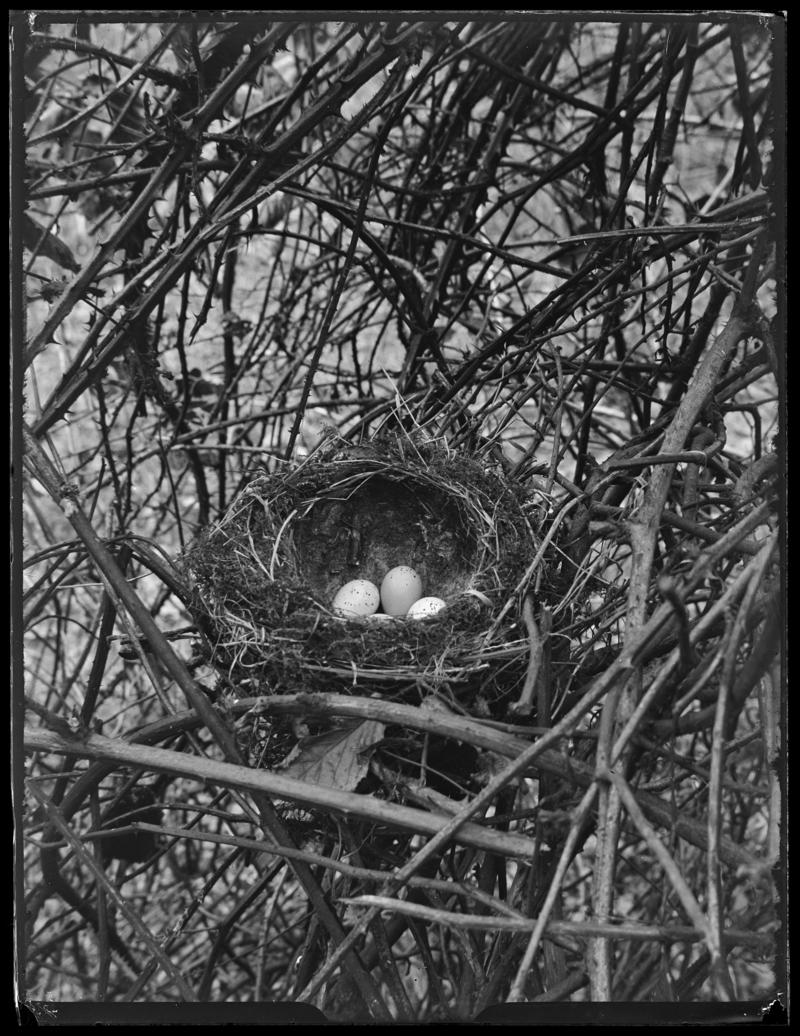 A Song Thrush (Turdus philomelos) nest with eggs. Photographed 26 June, 1908. Exposed at f/32.