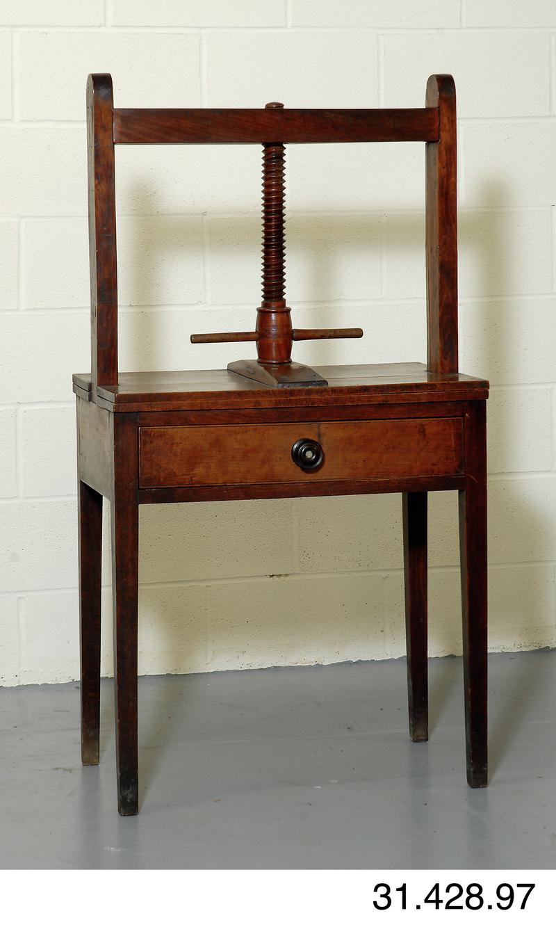 Hoover washing machine, white enamel body with wringer which can be folded down into the machine when not in use; a metal lid that covered the drum to prevent splashing could be attached to the other side of the wringer as a tray to receive the wrung clothes. Another metal lid which covers the top when machine is not used