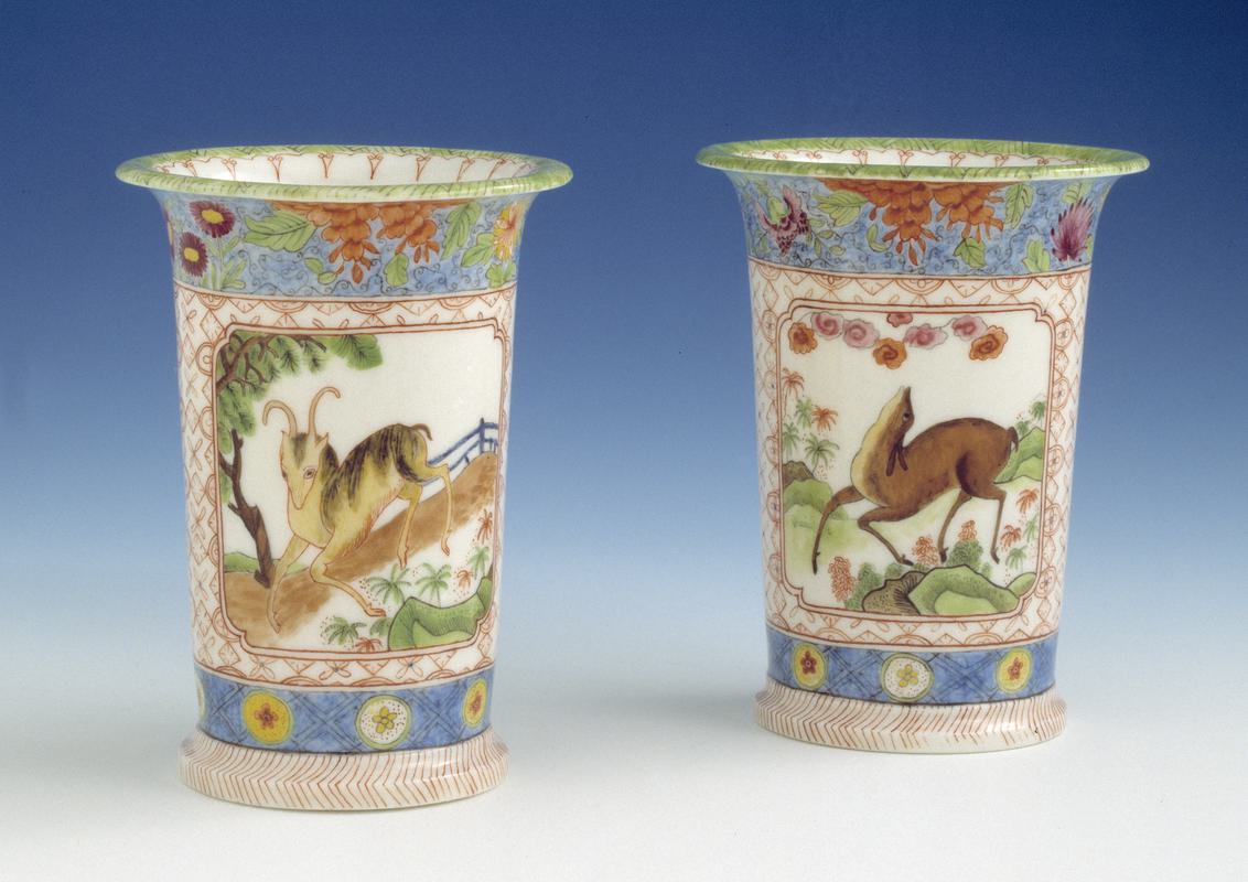 Spill vase, soft-paste porcelain, footring, circular foot, ring above foot, smooth body with slightly everted sides and a flared rim; glazed; body coated in a fine grit