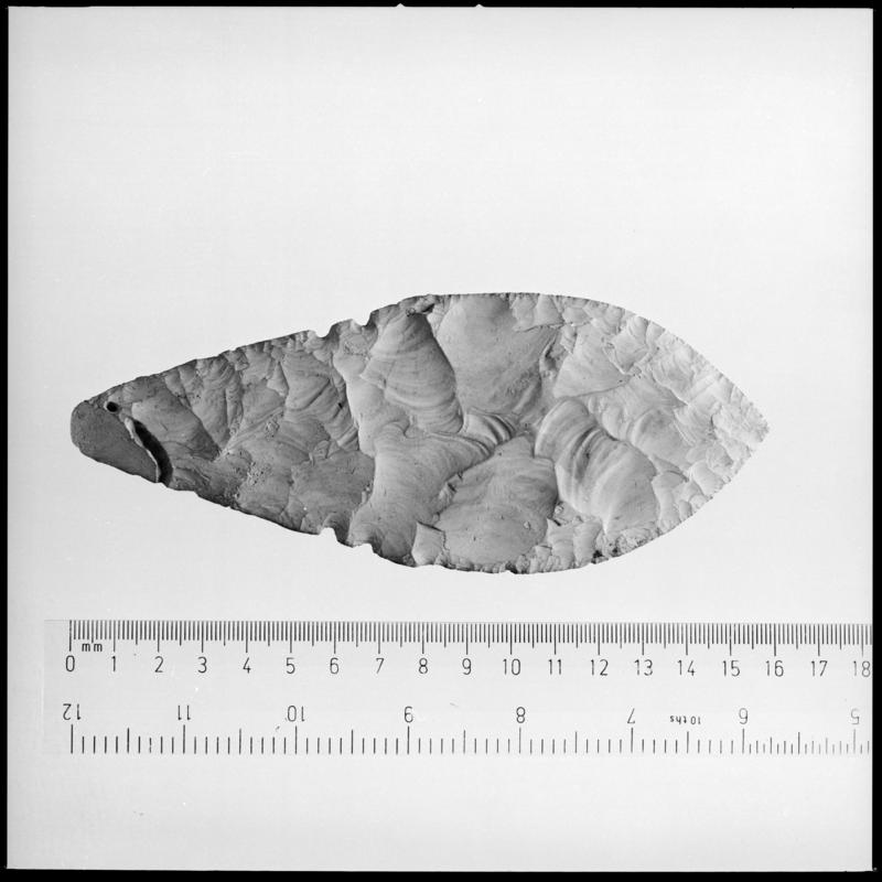 With lanceolate blade, demarcated from straight-sided pointed tang by two slight shoulders. Widest in the middle, the blade and tang being of equal length, with a pair of hafting notches on each side of the latter below the shoulders. The surface is well worked and ground in parts. Brown lines across the base of the blade mark the line of the handle.