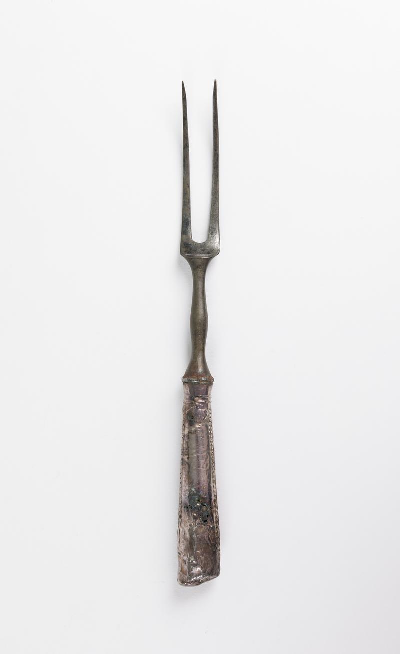 manure fork; 4 long curved tines, strapped to long wooden handles