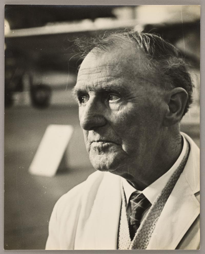 View of C.H. Watkins wearing fur helmet standing next to aeroplane. Printed on a postcard.