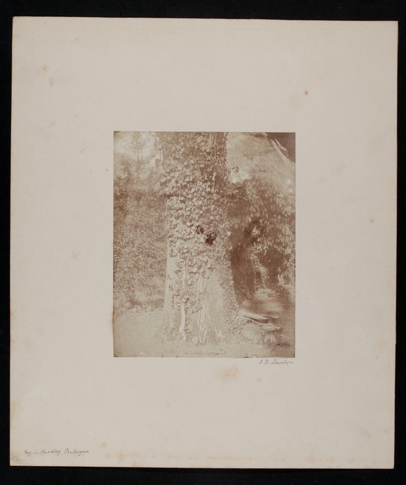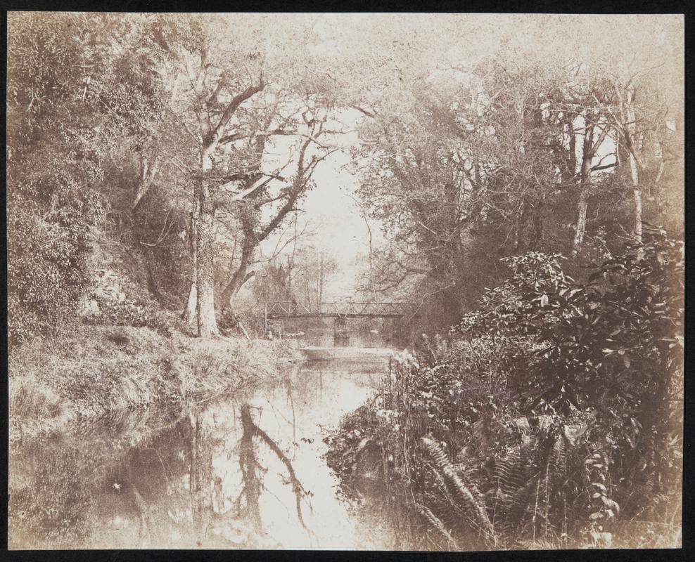 Mounted salted paper print showing the river with wooded banks and a bridge above the Upper Lake at Penllergare. The photograph is mounted and outlined in black ink.