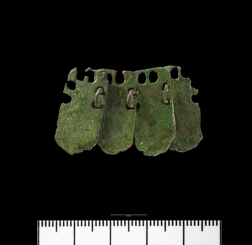 Three scales with slightly rounded lower edges, overlapped to right. They were laterally secured by wire of flat rectangular section with ends overlapped at back. The holes are pierced in vertical pairs at the middle of each edge, suggesting that they belong to the semi-rigid Corbridge/Mušov type, where instead of the scale being wired only to its horizontal neighbours and then sewn to a backing, it was also wired to the one above and the one below as well.