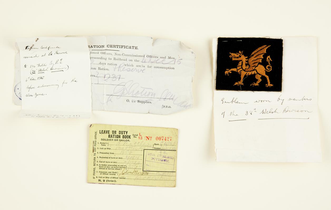 Red dragon emblem worn by members of the 38th (Welsh) Division. With explanatory note attached.
