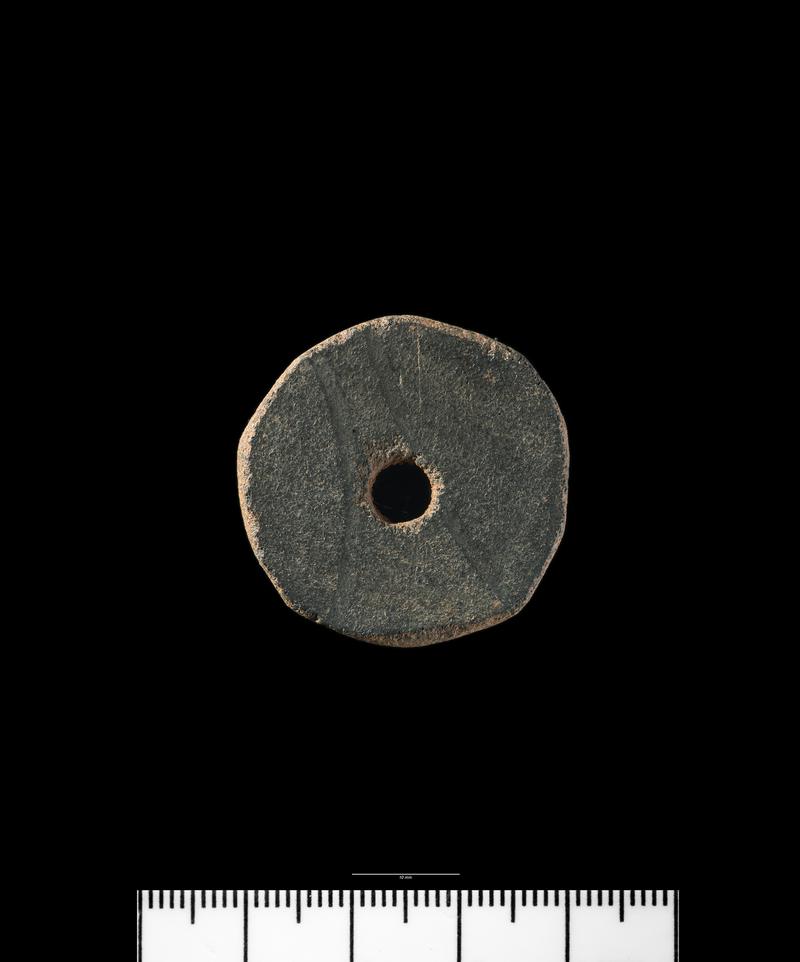 Half a caorse, sandstone spindel whorl with rounded edges and an hour-glass perforation.