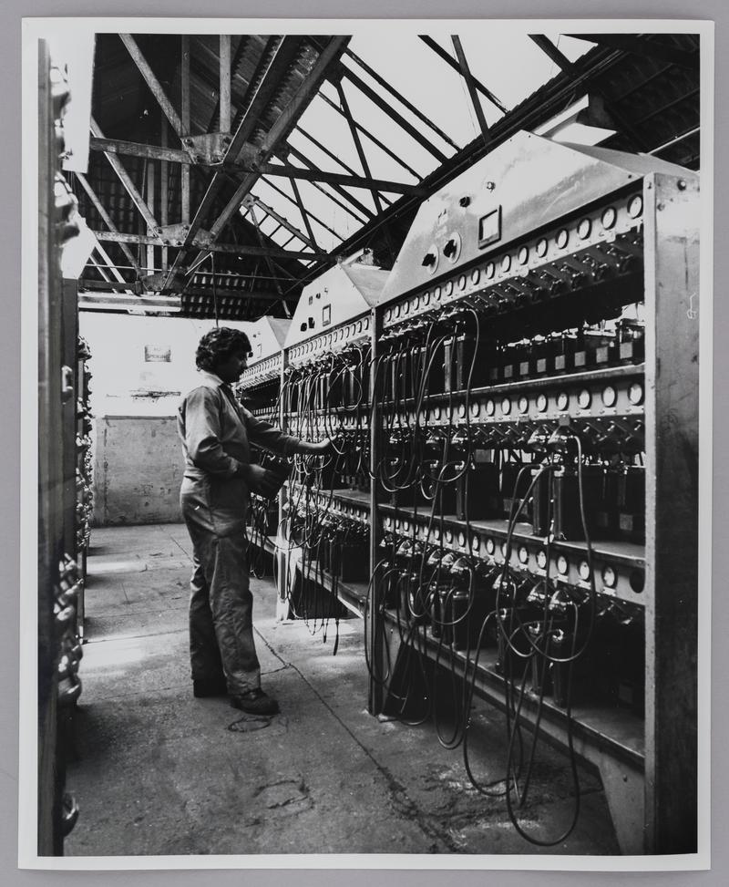 Colour film slide showing Dick, one of the Ty Mawr Colliery shaftsmen, carrying out a routine inspection of the Hetty Shaft from the roof of the cage, 30 June 1983.