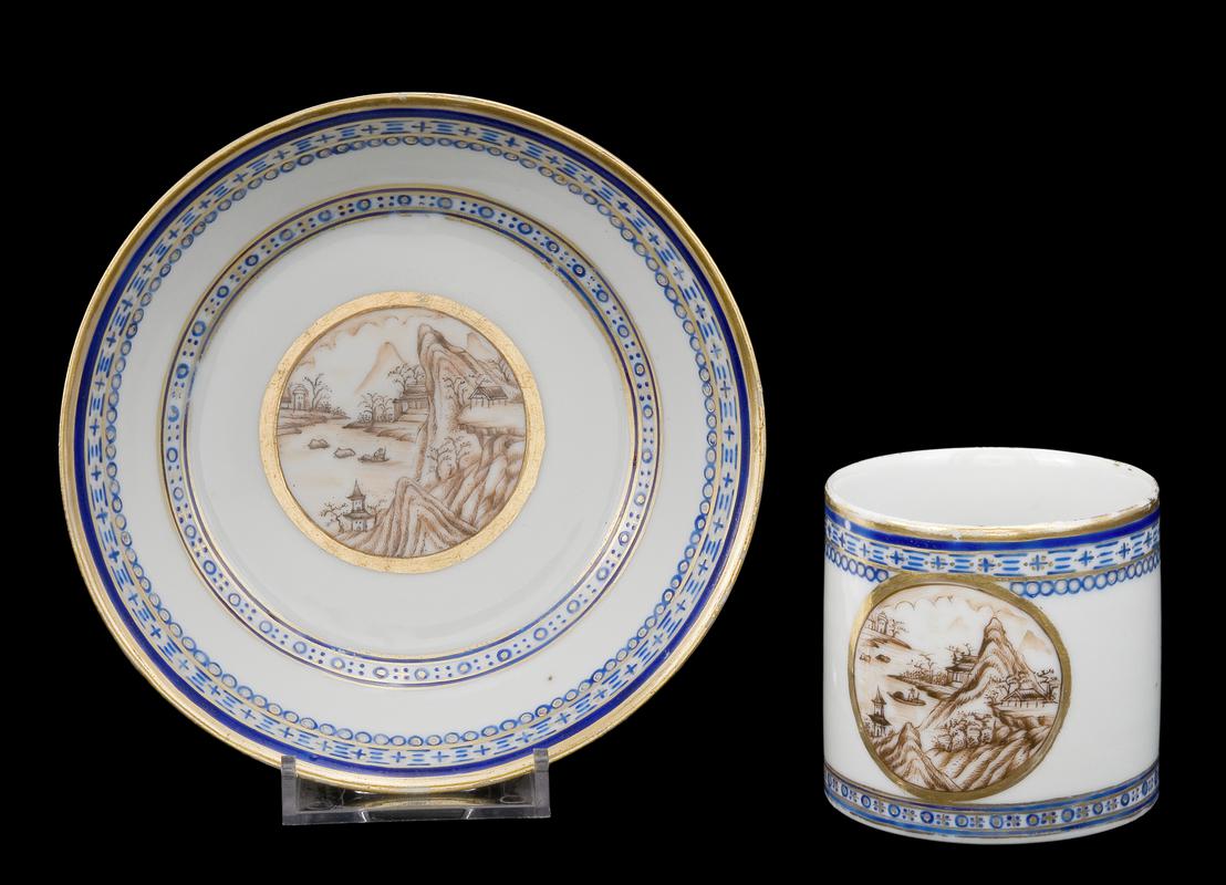 Vase with cover, hard-paste porcelain, inverted egg-shape with a spreading circular foot and a high cylindrical neck, domed cover with a flattened rim and a broken finial; the neck is decorated with a line border and a border of flower sprays in underglaze blue, the footring is decorated with a double line border in underglaze blue, the neck of the vase and the rim of the cover are banded with a cell and circle border in underglaze blue, the edge of the cover is gilded, painted with the willow pattern in underglaze blue.
