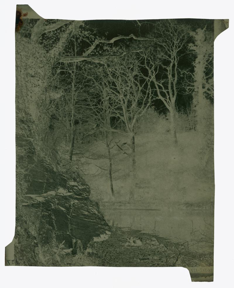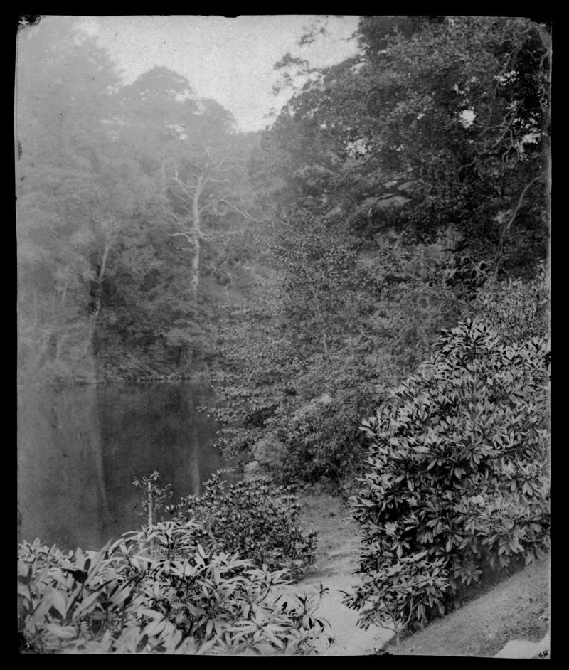 John Dillwyn Llewelyn ordered the construction of the two lakes at Penllergare in 1839. They impounded vast quantities of water with the Upper Lake descending over a man-made waterfall into the Lower Lake. In this carefully staged photograph Dillwyn Llewelyn has placed an umbrella, deck chair and basket on the path, and shows the old stone steps and bridge at the farthest end of the lake. The lakes were the subject of a number of photographs by JDL where he included the boat house, shanty, bridges, and waterfall. (Source: 'Pastures Green and Dark Satanic Mills: The British Passion for Landscape', 2015)