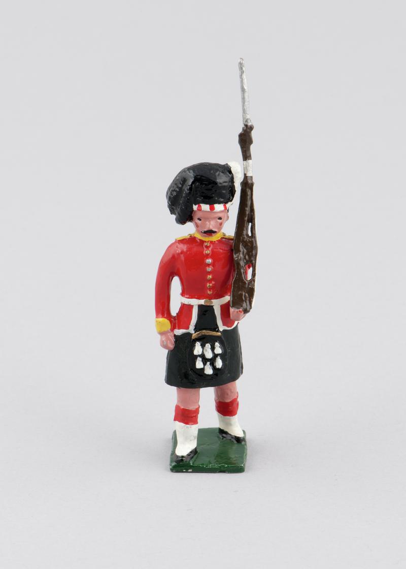 Model of an Argyll & Sutherland Highlander holding regimental colours (yellow), 1914. Left arm holds removable flag. Arm is movable. Hand-painted.