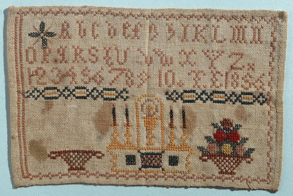 Pair of embroidered gloves, early 17th century. White leather with cuffs embroidered in coloured silks and metal thread. From Plas Llanfair, Llanfair-is-gaer.